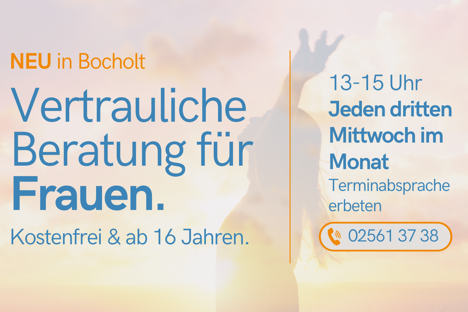 Damit das neue Beratungsangebot möglichst viele Frauen erreicht, startet begleitend eine Informationsaktion in der Region. Unternehmen, Einrichtungen und Institutionen aus Bocholt, Rhede und Isselburg können kostenfrei Poster und Visitenkarten erhalten, um in ihren Räumlichkeiten auf das Angebot aufmerksam zu machen.